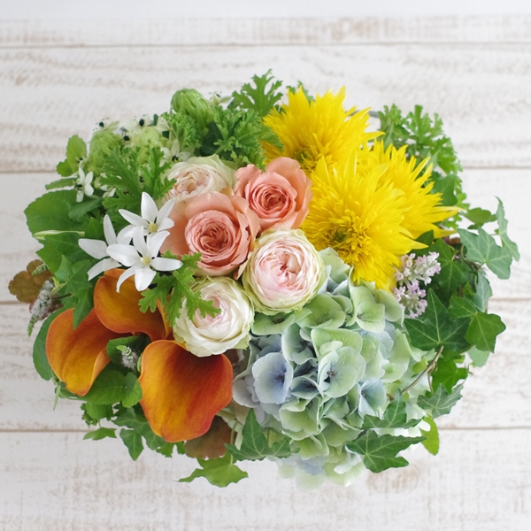 - ・花材・花器共に季節商品のため変更になる場合がございますが、できるだけ雰囲気を損なわないよう作成いたしますのでご了承ください。